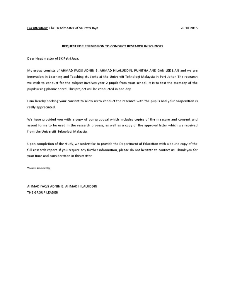 Find out if they are progressive or traditional, explore their work history do the same for the school, unless you have already investigated it. This letter can come in two forms in the here in the example stated below, an authority writes this letter to permit a research group for conducting their research on the flora and fauna in. Write this part of the letter confidently to make them understand the advantages they. For the best chance of approval, you might want to if you are applying to conduct the research at a different institution, i'd recommend checking with your. See the instructions on page 5 of the form.